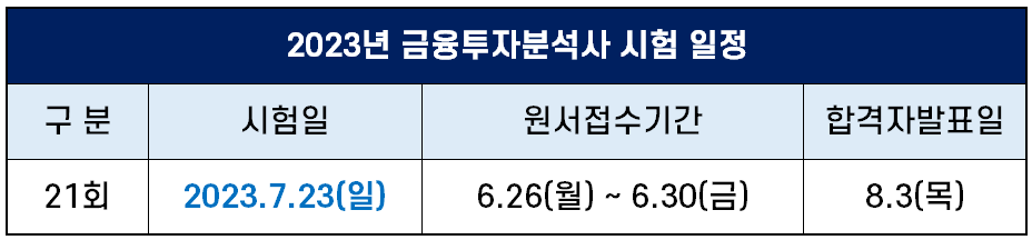 금융투자분석사는 매년 1회 시험을 시행하고 있는데요. 2023년에는 7월 23일 일요일에 시험을 시행하고, 원서접수기간과 합격자 발표일은 다음가 같습니다.