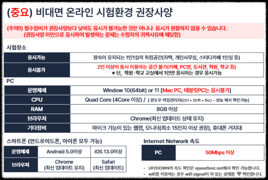 PC는 Window운영체제에서만 응시가능하고, 맥북이나 태블랫 PC에서는 응시 불가능하지만, 스마트폰은 안드로이드폰, 아이폰 모두 응시가능합니다.