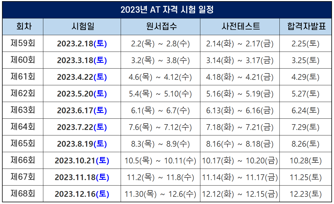 2023년 AT 자격 시험은 제59회부터 제68회까지 총 10회 시험이 시행되는데요. 각 회차별 시험일, 원서접수기간, 합격자 발표일 등 시험 일정은 다음과 같습니다.