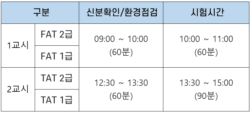 AT 자격시험은 시험 당일 다음과 같은 시간표에 따라 시험을 시행하는데요. 시험 시간이 60분인 FAT2급과 1급은 오전 10시부터 11시까지, 시험 시간이 90분인 TAT2급과 1급은 오후 1시 30분부터 3시까지 시행됩니다.