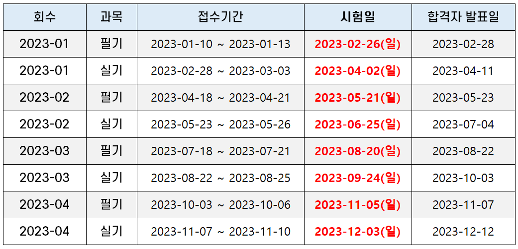 | 2023-01 | 실기 | 2023-02-28 ~ 2023-03-03 | 2023-04-02(일) | 2023-04-11 |