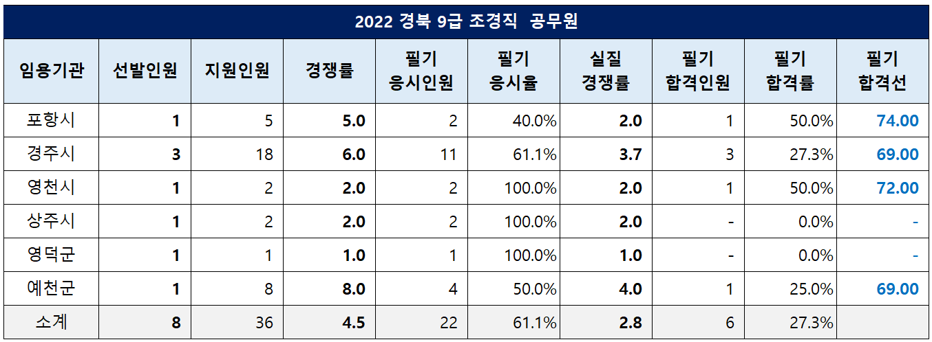 경북 상주시와 영덕군은 필기시험 합격자가 없었고, 경쟁률이 5.0대 1이었던 포항시 필기 합격선은 74.00점이며, 경쟁률이 6.0대 1이었던 경주시 커트라인은 69.00점이었습니다.
