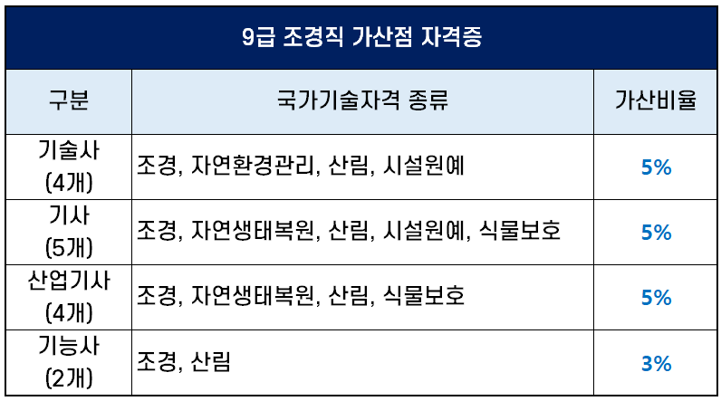 9급 조경직 공무원은 만 18세 이상이면 누구나 응시가능한데요. 응시자가 조경업무와 관련있는 국가기술자격증을 소지한 경우 필기시험에서 가산점을 주고 있습니다.