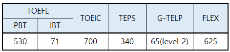 7급 임업직 공무원 1차 시험 합격에 필요한 한국사능력시험 기준 등급은 2등급 이상, 영어시험 시험 종류 및 기준 점수는 아래 표와 같습니다.