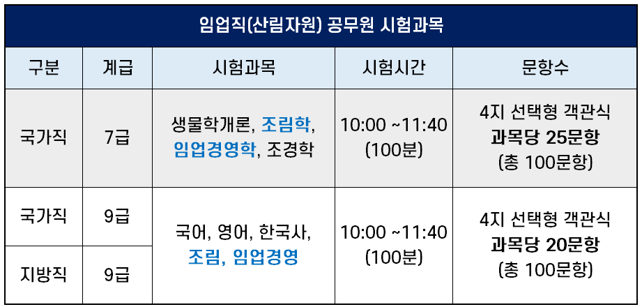 임업직 공무원 시험 과목 및 시험 시간