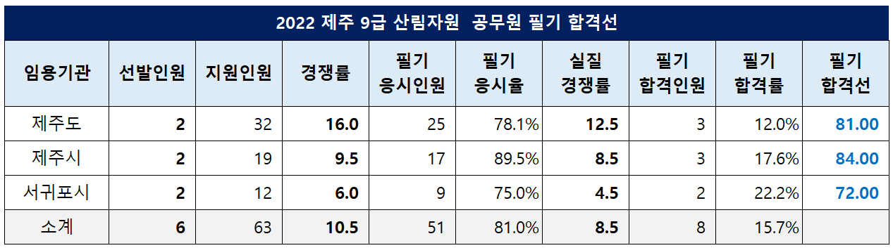 제주 9급 산림자원직 공무원은 6명을 선발하는데 63명이 지원해 10.5대 1의 경쟁률을 기록했고, 필기시험 응시율은 81.04%, 실질 경쟁률은 8.5대 1이었습니다.