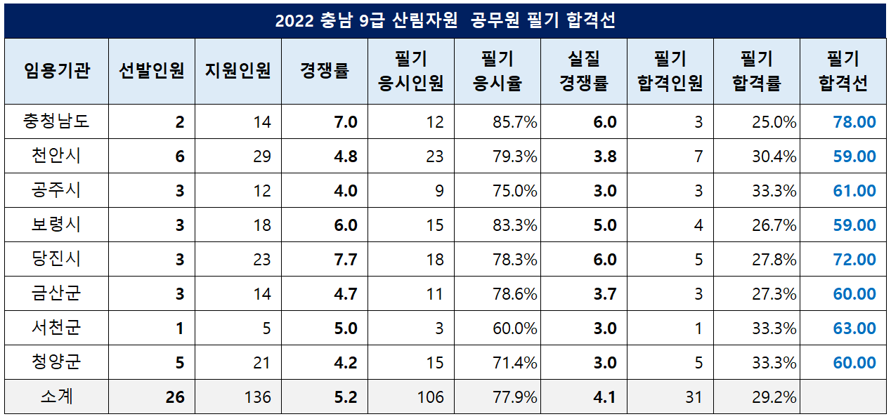 충남 9급 산림자원직 공무원은 26명을 선발하는데 136명이 지원해 5.2대 1의 경쟁률을 기록했고, 필기시험 응시율은 77.9%, 실질 경쟁률은 4.1대 1이었습니다.