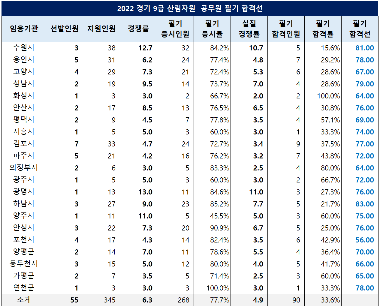 경기도 9급 산림자원직 공무원은 55명을 선발하는데 345명이 지원해 6.3대 1의 경쟁률을 기록했고, 필기시험 응시율은 77.7%, 실질 경쟁률은 4.9대 1이었습니다.