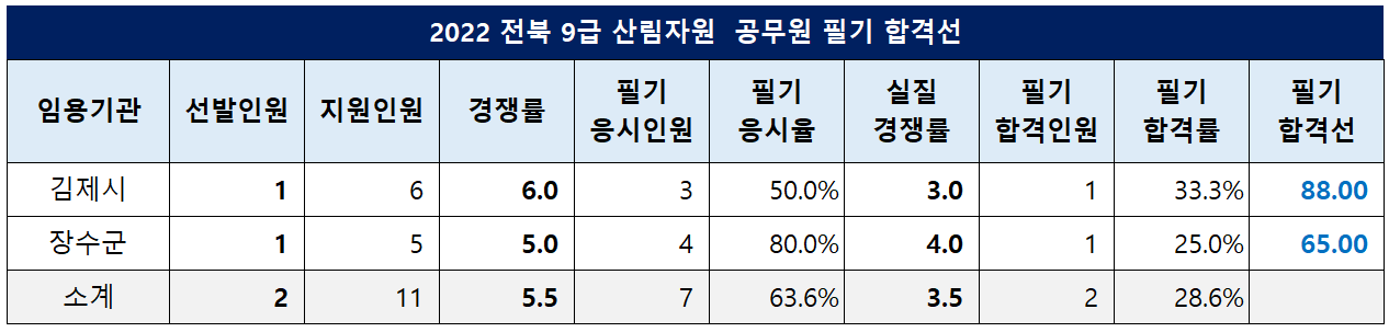 전북 김제시 산림자원직 필기 합격선은 88.00점, 장수군의 합격선은 65.00점이었습니다.
