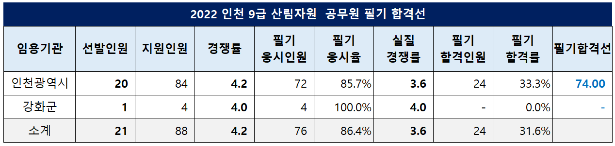 인천광역시가 임용하는 산림자원직 공무원 필기 합격선은 74.00점입니다.