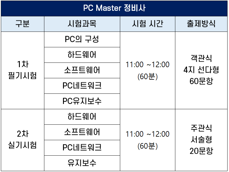 PC 마스터 정비사 1차 필기시험 과목은 PC의 구성, 하드웨어, 소프트웨어, PC네트워크, PC유지보수의 5과목이며, 객관식 4지 선다형 60문제가 출제되고, 시험 시간은 11시부터 12시까지 60분입니다.