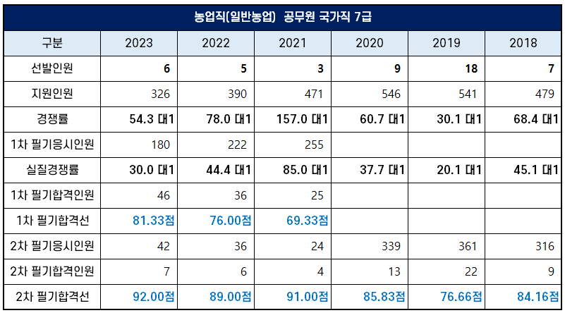 2023년까지 최근 시행된 7급 농업직 공무원 선발인원, 경쟁률, 필기 합격선을 아래 표로 정리했습니다.