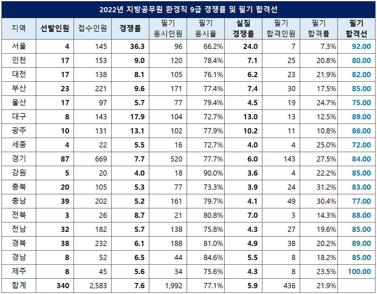 이번 포스팅에서는 2022년 공채시험을 시행한 17개 지역의 9급 지방 환경직 공무원의 선발인원, 원서접수인원, 경쟁률(원서접수인원 대비 경쟁률), 필기시험 응시인원, 응시율, 실질 경쟁률(필기시험 응시인원 대비 경쟁률), 필기시험 합격인원, 합격률, 합격선(커트라인)등에 대해 정리했습니다.