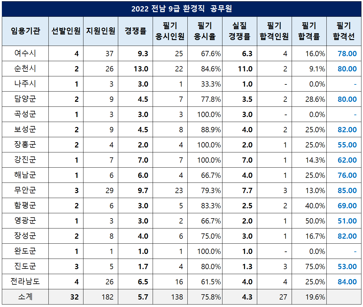 전남 9급 환경직 공무원은 32명을 선발하는데 182명이 지원해 5.7대 1의 경쟁률을 기록했고, 필기시험 응시율은 75.8%, 실질 경쟁률은 4.3대 1이었습니다.