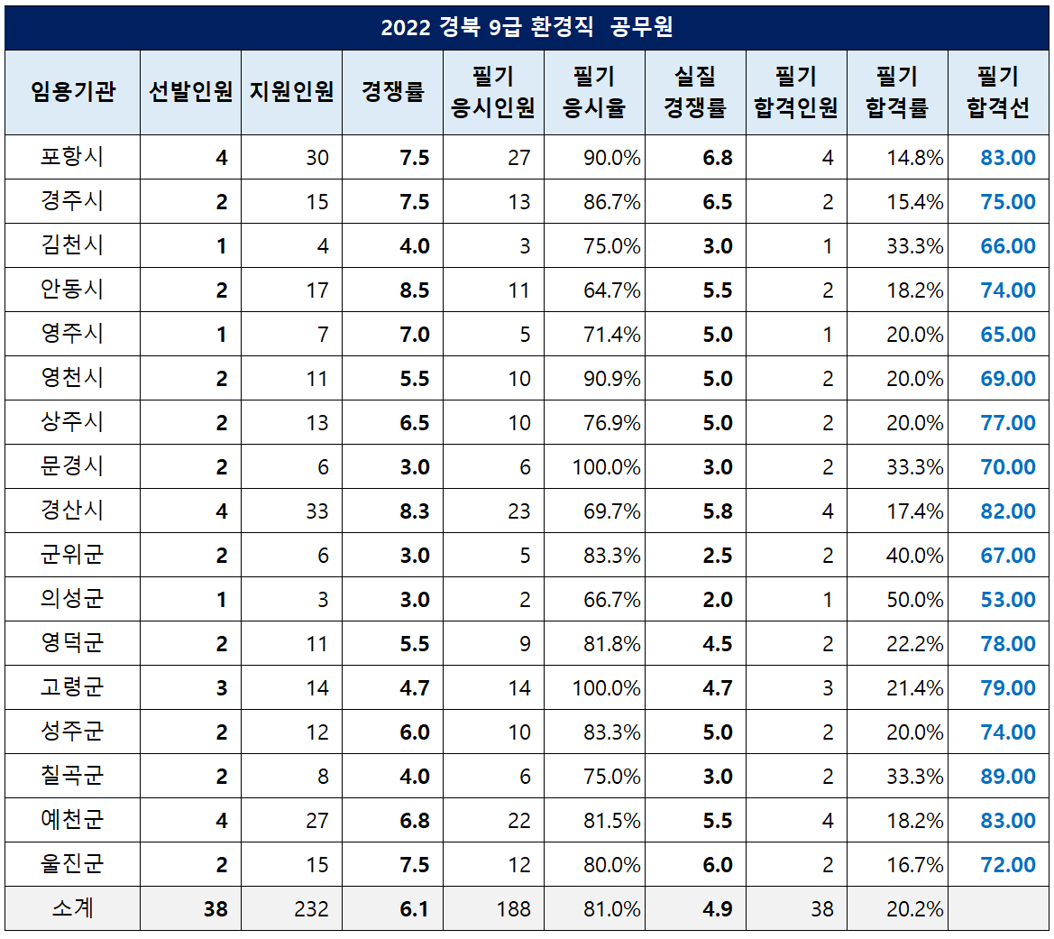 경북 환경직 공무원 필기 합격선은 칠곡군이 89.00점으로 가장 높았고, 포항시와 예천군이 83.00점, 경산시가 82.00점을 기록했던 반면, 의성군이 53.00점으로 가장 낮았습니다.