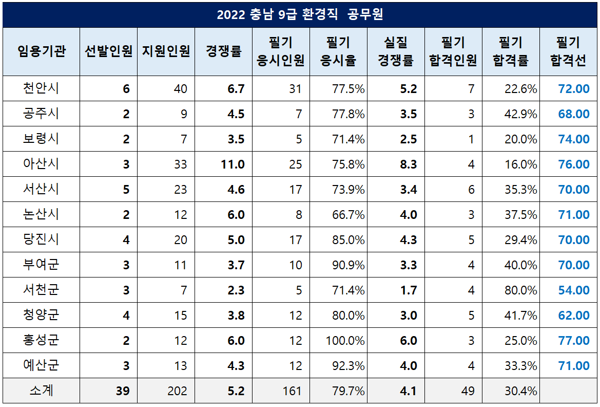 충청남도 환경직 공무원 필기 합격선은 홍성군이 77.00점으로 가장 높았고, 아산시가 76.00점, 보령시가 74.00점, 천안시가 72.00점이었던 반면, 서천군이 54.00점으로 가장 낮았습니다.