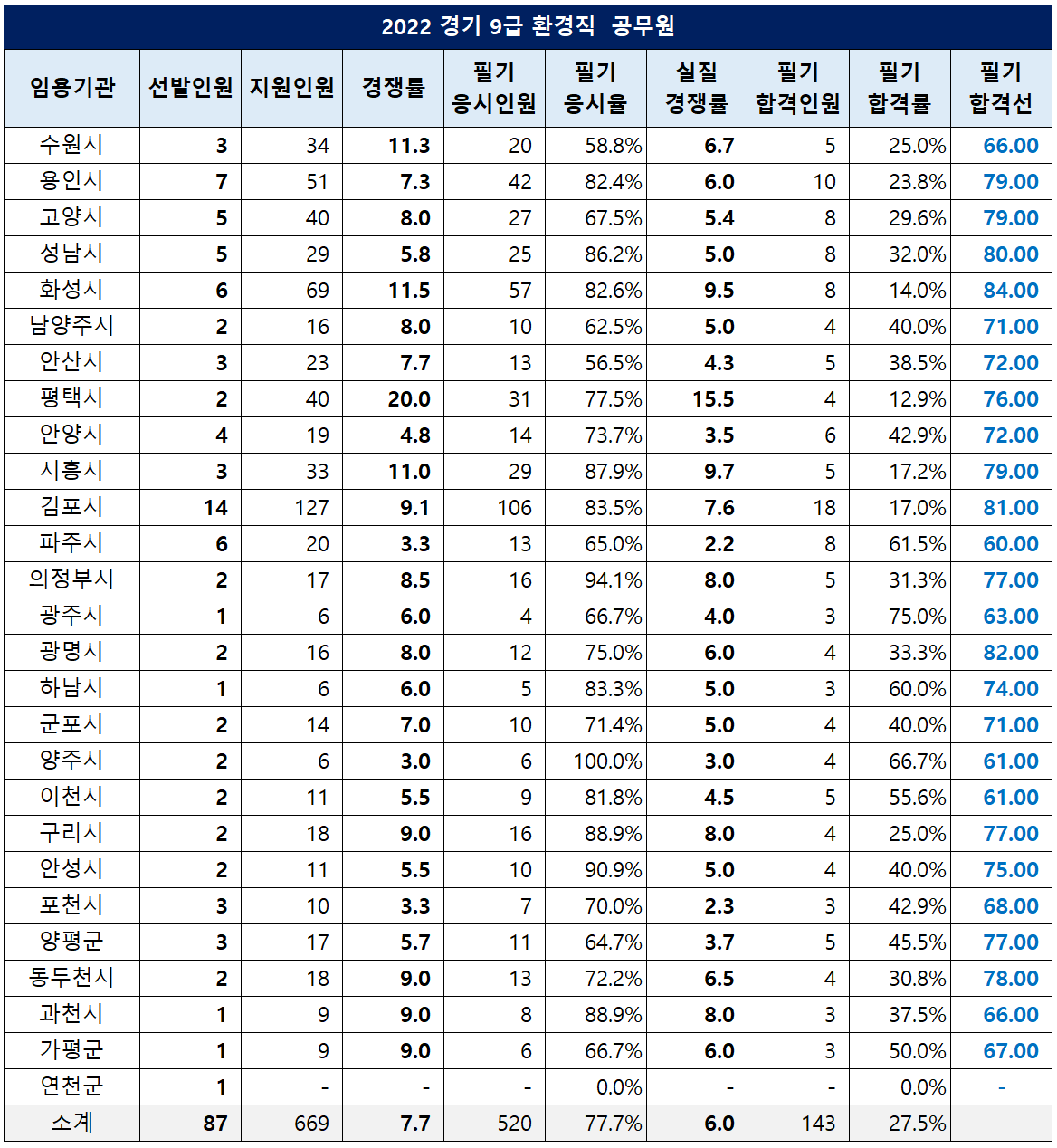 경기 9급 환경직 공무원은 87명을 선발하는데 669명이 지원해 7.7대 1의 경쟁률을 기록했고, 필기시험 응시율은 77.7%, 실질 경쟁률은 6.0대 1이었습니다.