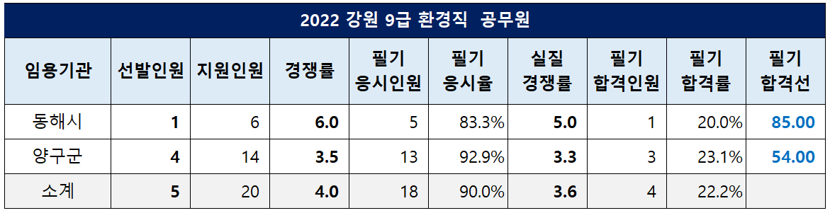강원도 동해시 환경직 합격선이 85.00점, 양구군 합격선이 54.00점이었습니다.