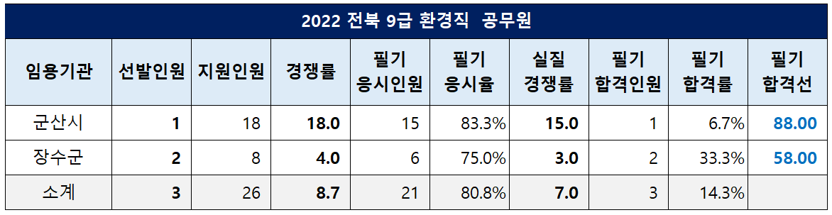 전라북도 군산시 환경직 필기 합격선이 88.00점, 장수군 합격선이 58.00점이었습니다.