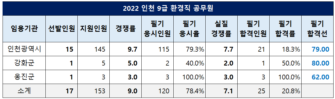 인천시 9급 환경직 공무원은 17명을 선발하는데 153명이 지원해 9.0대 1의 경쟁률을 기록했고, 필기시험 응시율은 78.4%, 실질 경쟁률은 7.1대 1이었습니다.