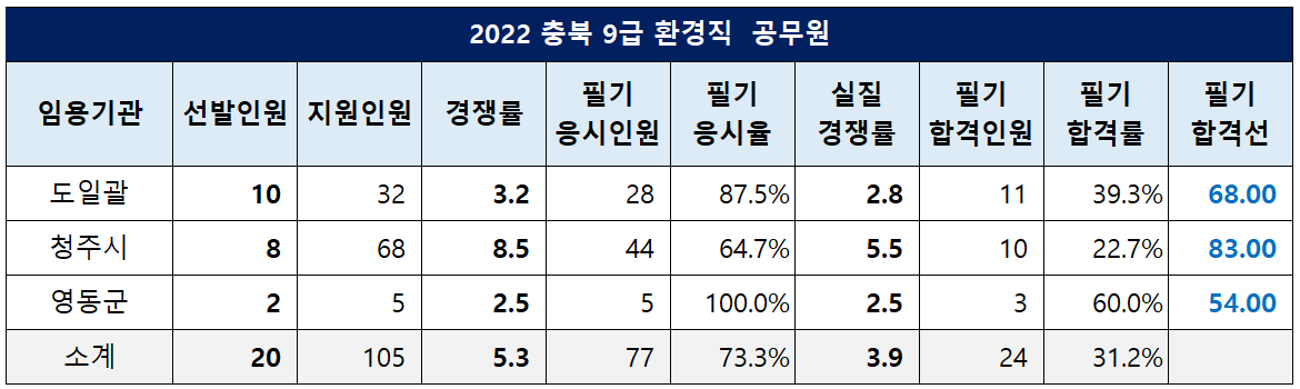 충북 환경직 공무원은 청주시 필기 합격선이 83.00점, 도일괄 모집 합격선이 68.00점, 영동군 커트라인이 54.00점이었습니다.