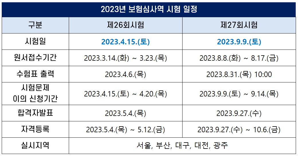 보험심사역 자격시험은 상반기와 하반기에 1회씩 시험을 시행해 연간 2회 응시기회가 있는데요. 2023년 제26회 보험심사역 시험은 4월 15일(토)에, 제27회 보험심사역 시험은 9월 9일(토)에 시행되고, 원서접수기간 및 합격자 발표일 등 시험 일정은 다음과 같습니다.