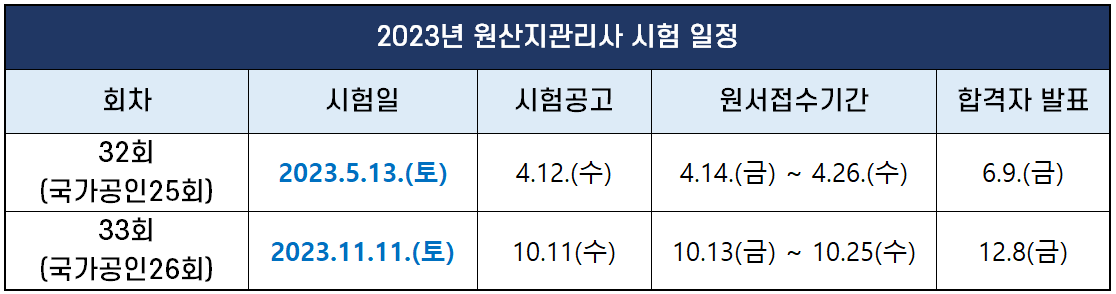 2023년 제32회(국가공인 제25회) 시험은 5월 13일(토)에 시행되고, 제33회(국가공인 제26회) 시험은 11월 11일(토)에 시행되며, 시험 공고일, 원서접수기간, 합격자 발표일 등 시험 일정은 다음과 같습니다.