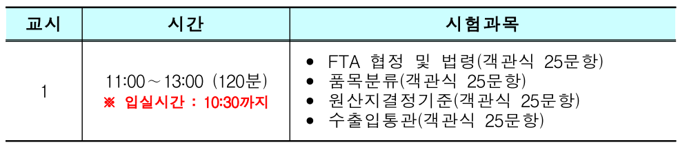 원산지관리사 시험은 시험 당일 오전 11시부터 오후 1시까지 2시간(120분) 동안 시행되며, 10시 30분까지 입실을 완료해야 합니다.