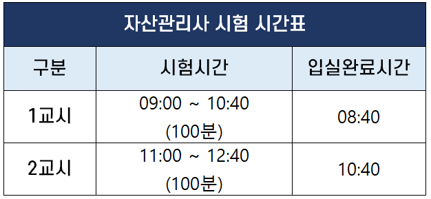 자산관리사 시험은 시험 당일 오전 9시부터 오후 12시 40분까지 아래 시간표에 따라 시행되는데요.