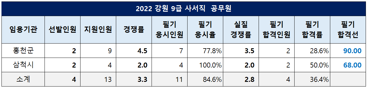 강원도 홍천군 사서직 필기 합격선이 90.00점, 삼척시 커트라인이 68.00점이었습니다.
