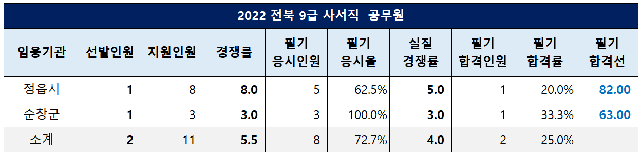 전북 9급 사서직 공무원은 2명을 선발하는데 11명이 지원해 5.5대 1의 경쟁률을 기록했고, 필기시험 응시율은72.7%, 실질 경쟁률은 4.0대 1이었습니다.