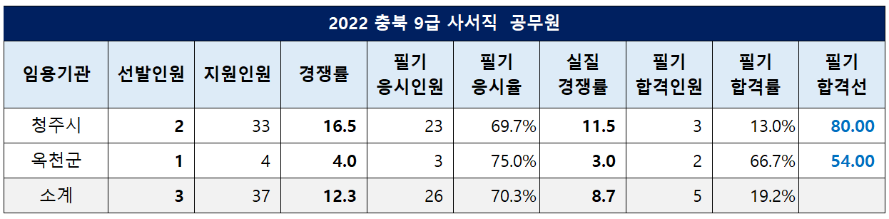 충청북도 청주시 사서직 공무원 필기 합격선이 80.00점이었고, 옥천군 커트라인이 54.00점이었습니다.
