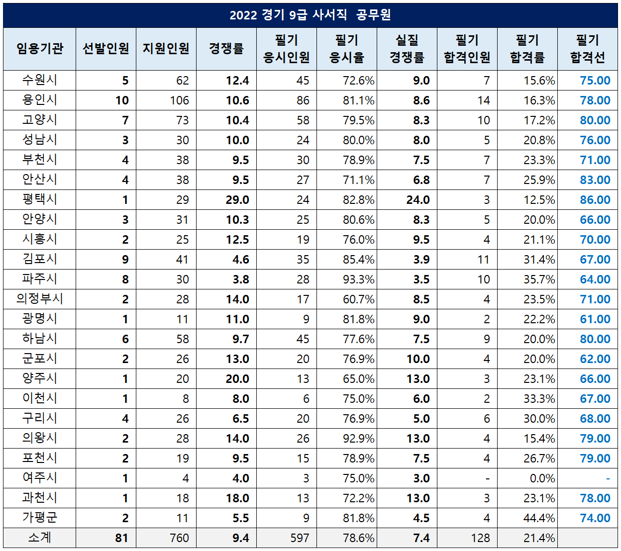 경기 9급 사서직 공무원은 81명을 선발하는데 760명이 지원해 9.4대 1의 경쟁률을 기록했고, 필기시험 응시율은 78.6%, 실질 경쟁률은 7.4대 1이었습니다.
