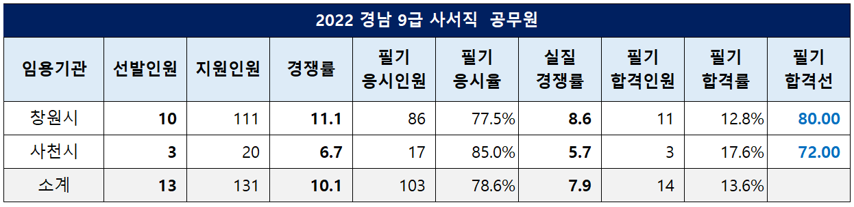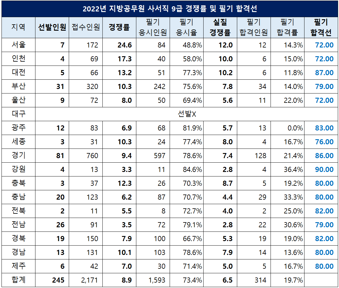 2022년 지방공무원 사서직 선발인원, 경쟁률 및 필기 합격선을 아래 표로 정리했습니다.