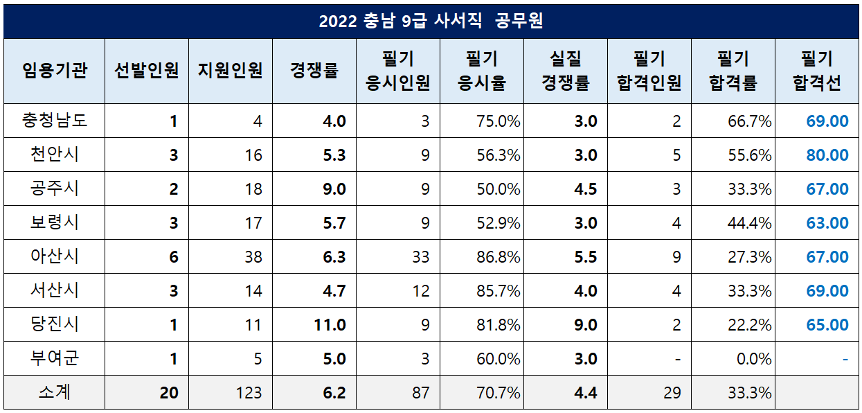충남 9급 사서직 공무원은 20명을 선발하는데 123명이 지원해 6.2대 1의 경쟁률을 기록했고, 필기시험 응시율은 70.7%, 실질 경쟁률은 4.4대 1이었습니다.
