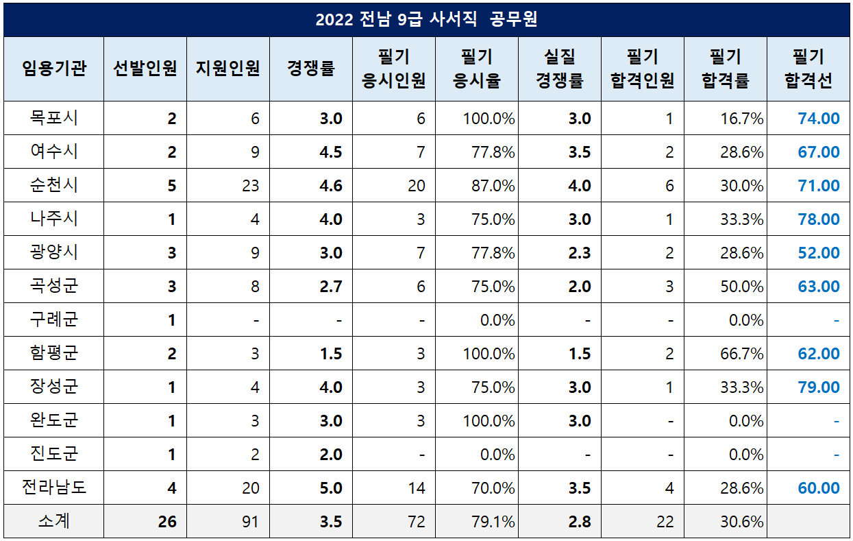 전남 9급 사서직 공무원은 26명을 선발하는데 91명이 지원해 3.5대 1의 경쟁률을 기록했고, 필기시험 응시율은 79.1%, 실질 경쟁률은 2.8대 1이었습니다.