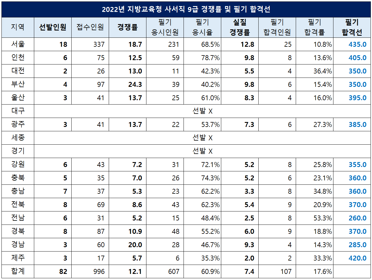 | 2022년 지방교육청 사서직 9급 경쟁률 및 필기 합격선 | |||