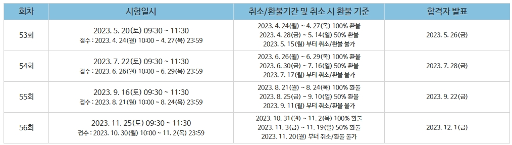 2023년에 시행되는 국제무역사 온라인 시험은 다음과 같이 53회부터 56회까지 총 4회 실시하며, 합격자발표일이 기존 17일에서 6일로 단축되었습니다.