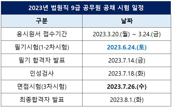 | 2023년 법원직 9급 공무원 공채 시험 일정 | |