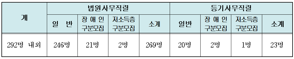 2023년 9급 법원직 공무원은 법원사무직렬에서 269명, 등기사무직렬에서 23명을 선발해 총 292명 내외의 공무원을 신규 선발할 예정입니다.