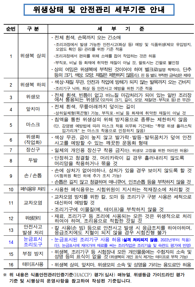 | 20 | 위생복 | 상의-흰색/긴소매, 하의-긴바지(색상무관) | *위생복장(위생복,위생모,앞치마,마스크)을 착용하지 않을 경우 채점대상에서 제외(실격)됩니다. |