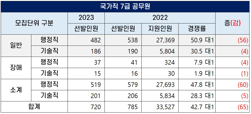 785명을 선발한 2022년에 비해 2023년 7급 공무원 공채 선발인원이 65명 감소했습니다.
