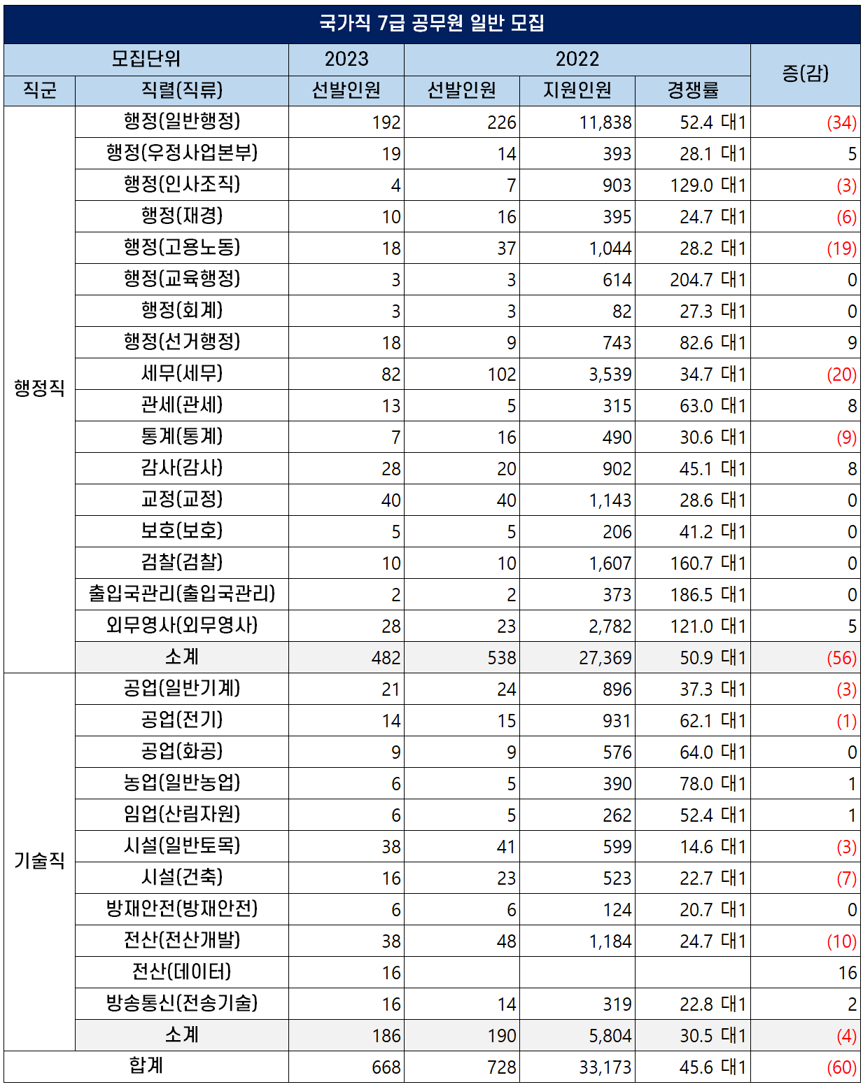 2023년 7급 국가직 공무원은 일반모집으로 행정직 482명, 기술직 186명을 선발해 총 668명을 모집합니다. 728명을 선발했던 지난해에 비해 모집인원이 60명이 줄었는데요. 행정직 티오는 56명, 기술직 티오는 4명이 감소했습니다.