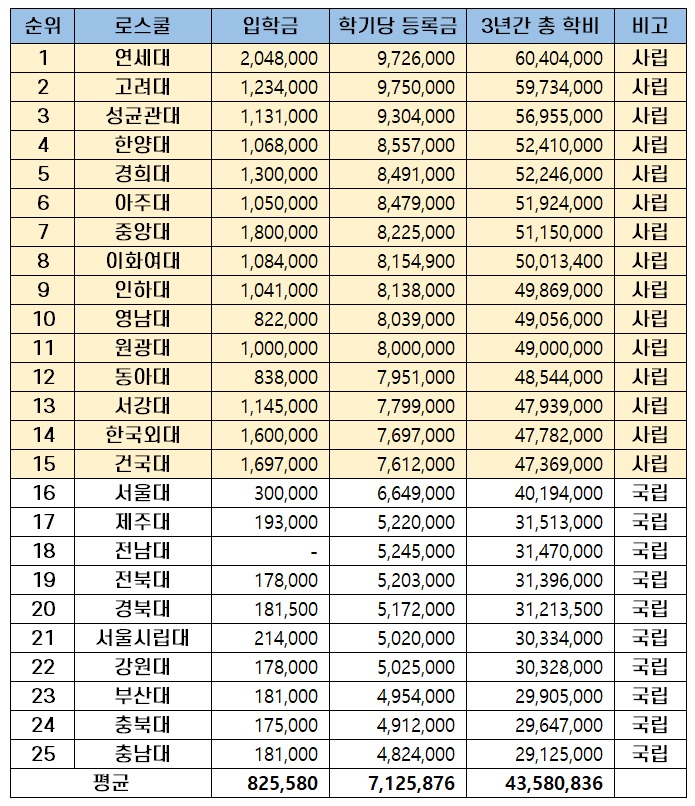연세대에 이어 고려대도 3년간 학비가 약 6천 만원(59,734천원)이고, 성균관대가 약 5천7백만 원(56,955천 원)입니다.