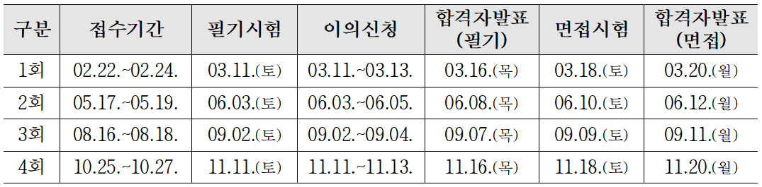 | 면접시험 | 03.18.(토) | 06.10.(토) | 09.09.(토) | 11.18.(토) |
