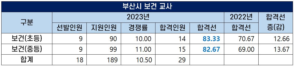 부산시 보건교사 합격선은 초등이 83.33점, 중등이 82.67점입니다.