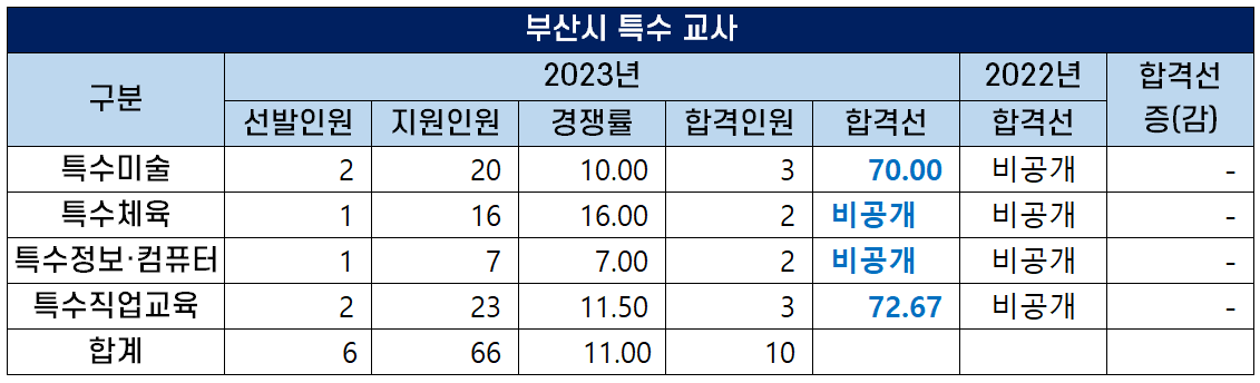 부산시는 다른 지역과 달리 특수교사를 특수미술, 특수체육, 특수정보·컴퓨터, 특수직업교육의 4가지 세부 교과과목으로 구분해 선발하고 있는데요. 각 합격선은 아래 표와 같습니다.