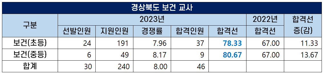 경상북도 보건교사 커트라인은 중등이 80.67점, 초등이 78.33점입니다.