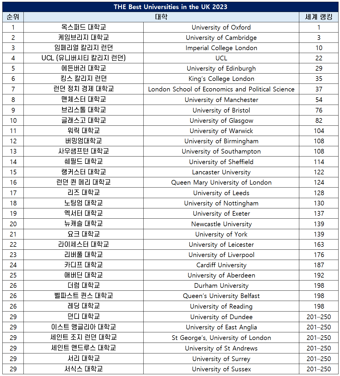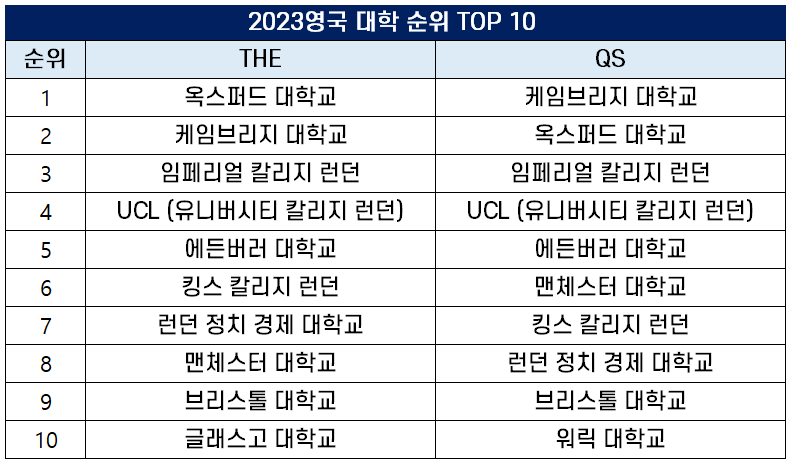 영국의 교육 주간지 THE(Times Higher Education)와 영국의 대학평가기관인 QS (Quacquarelli Symonds)에서 발표한 2023년 영국 대학 순위 TOP10을 보면 공통적으로 옥스퍼드 대학교, 케임브리지 대학교, 임페리얼 칼리지 런던, UCL(유니버시티 칼리지 런던), 에든버러 대학교, 맨체스터 대학교, 킹스 칼리지 런던, 런던 정치 대학교, 브리스톨 대학교의 9개 대학이 공통적으로 포함되어 있습니다.