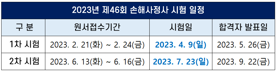 2023년 손해사정사 1차 및 2차 시험일, 원서접수기간, 합격자 발표일 등 시험 일정은 다음과 같습니다.